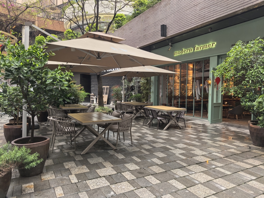在瑞虹新天地月亮湾,只要天气晴好,在以自然风格餐饮为特色的餐厅modern farmer(摩登农夫),10余个外摆位一座难求。住在瑞虹新城的刘洋说,自己在国外生活多年,习惯了坐在室外一边吃饭一边惬意聊天。每次来这里必选外摆位,边上还有柠檬、石榴、桂花树,置身其中,既能享受户外阳光,又能被绿意环抱。