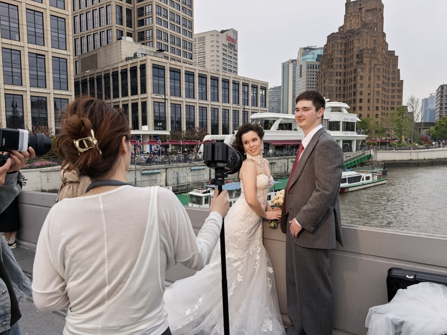 一对外国夫妇正在以虹书舫等为背景拍摄婚纱照。周楠 摄