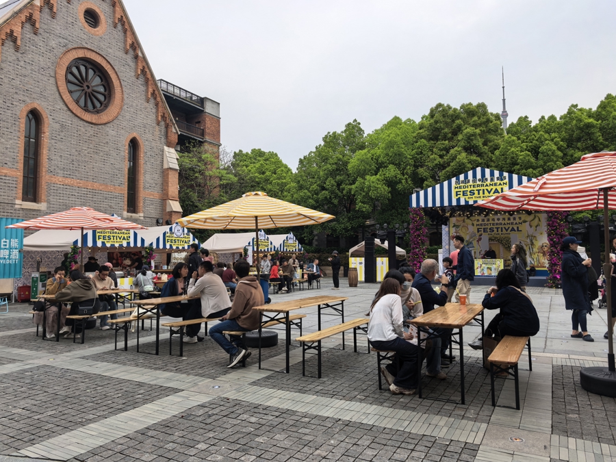 过了乍浦路桥,圆明园路上,一场热热闹闹的外滩源地中海美食节正在进行。在古朴的历史建筑前,伴着潮流的音乐,烟火气的市集和临时外摆位的出现,为原本安静的历史街区增添了十足的人气和活力。