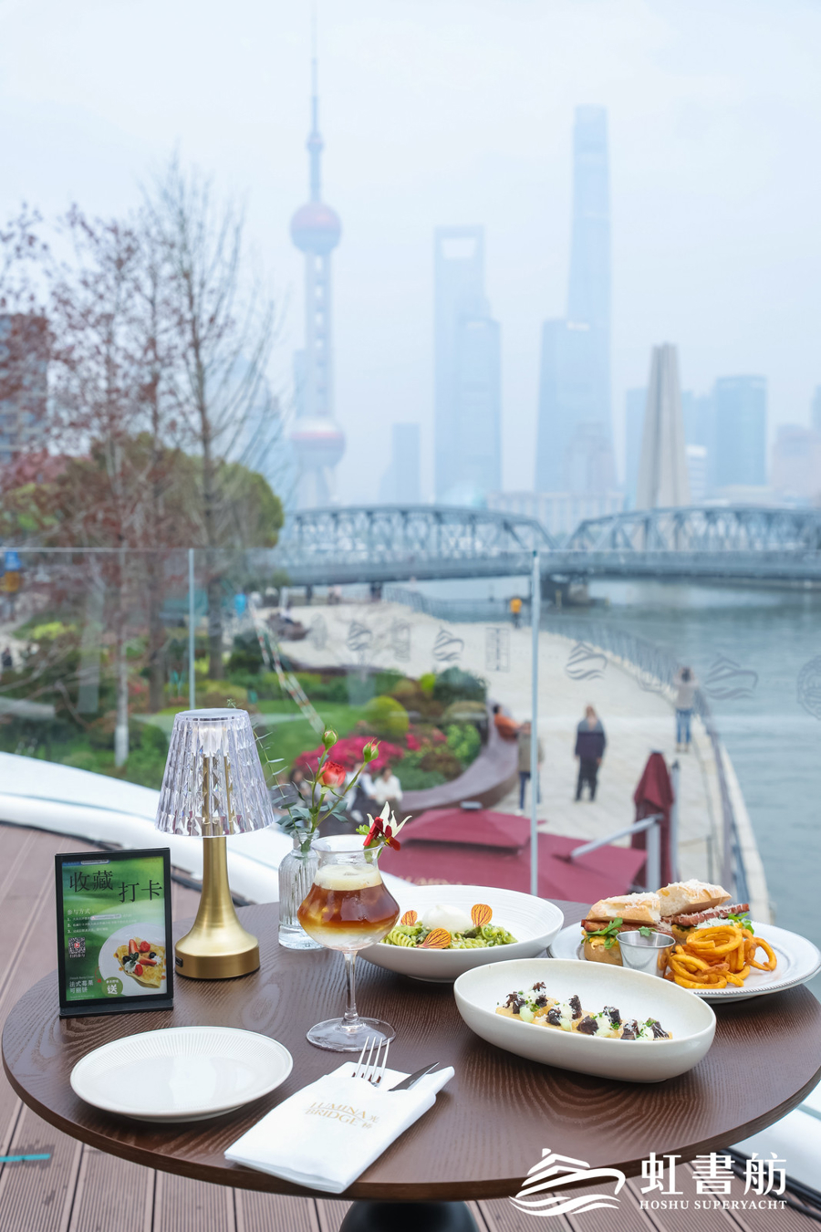 除了市民在这里聚餐会友,也有不少外地游客到此用餐。从苏州来的李小姐,在社交媒体上刷到了虹书舫,特意点了一杯招牌特调的世纪同框拿铁拍照,背对着陆家嘴“三件套”和外白渡桥,顺手发了朋友圈,配文“上海太有创意了”。