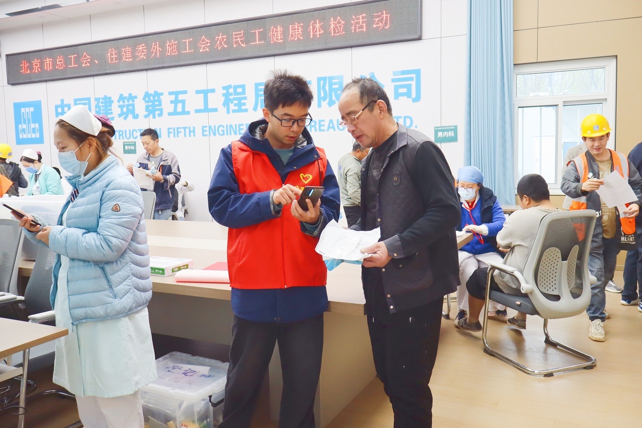近日,北京市总工会、住建委外施工会联合首都医科大学北京康复医院、中建五局北京公司开展的2026年农民工健康体检活动走进中建五局北京公司通州宋庄青艺工坊项目。本次活动为参建通州宋庄青艺工坊项目的300名一线工友送上健康体检套餐,将专业医疗服务精准送达施工一线。